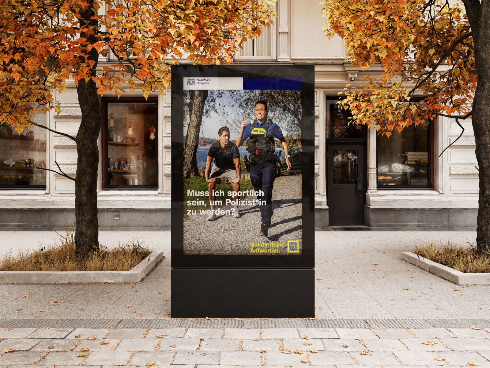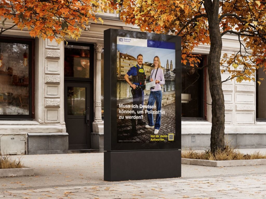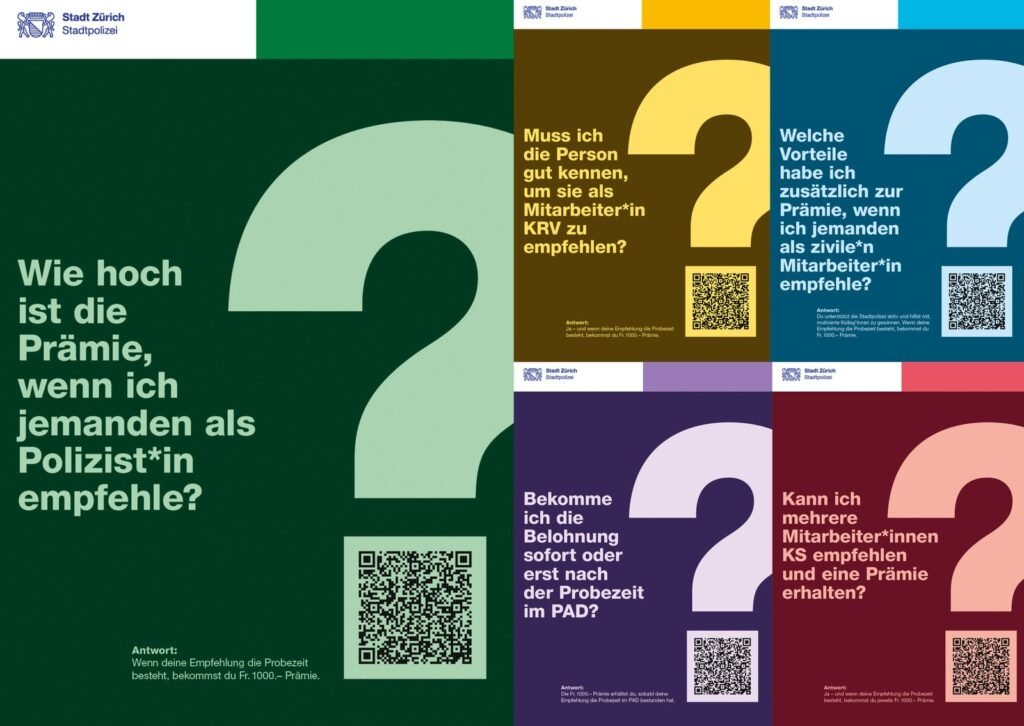 Visuell arbeitet die Kampagne mit realen Mitarbeitenden der Stadtpolizei Zürich. Ergänzt werden die Sujets durch bewusst zugespitzte Alltagssituationen, die typische Unsicherheiten potenzieller Bewerbender thematisieren. So entsteht eine Bildsprache, die Aufmerksamkeit schafft, nahbar wirkt und gleichzeitig sachlich bleibt.